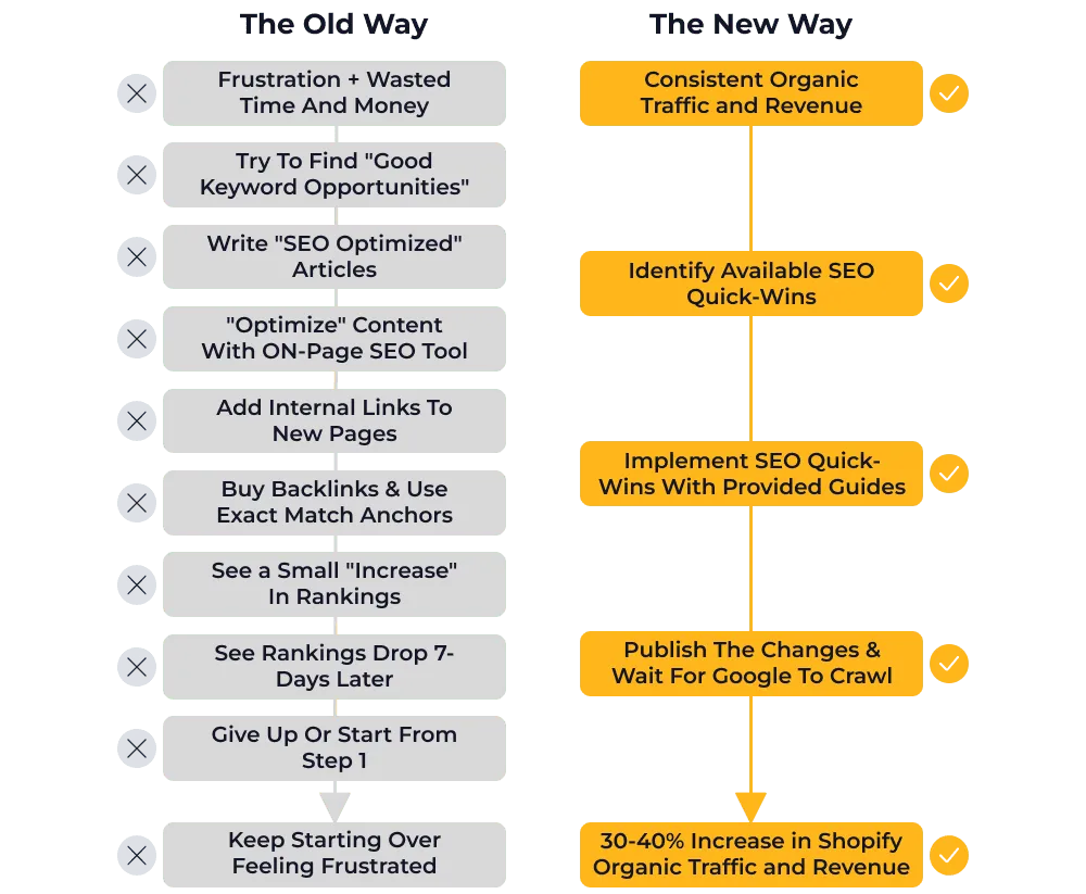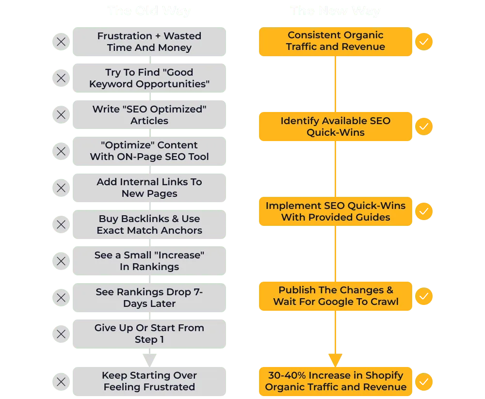 There's no fluff here. I need you to win, so I can win. Everything is based off the same SEO strategy I used to generate over $25MM in additional organic revenue for my own and my client's Shopify stores.